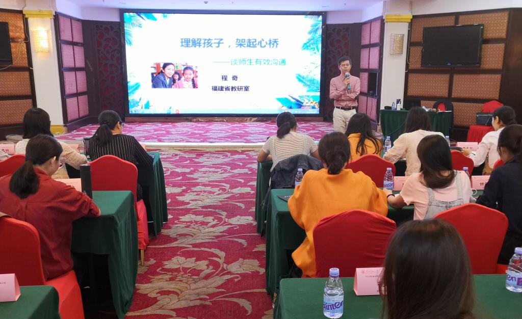 福建省普教室教研员程奇老师在《理解孩子,架起心桥——谈师生有效沟通》的专题中强调师生之间的有效沟通首先要理解孩子的内心,重点是要陪伴孩子,和孩子在一起。强调心理工作者的内在修炼是关照内在心灵;包容不同观念;储备人际资源。