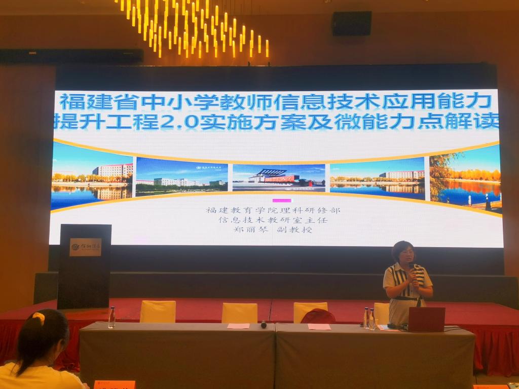 开班仪式结束后,第一场专项培训正式开始,由福建教育公司信息技术研修部郑丽琴副教授进行文件解读与政策理解。郑丽琴副教授从信息技术提升工程2.0“是什么”、“与1.0的区别”、“目标任务”、“各级分工职责”等方面向与会老师们进行介绍。