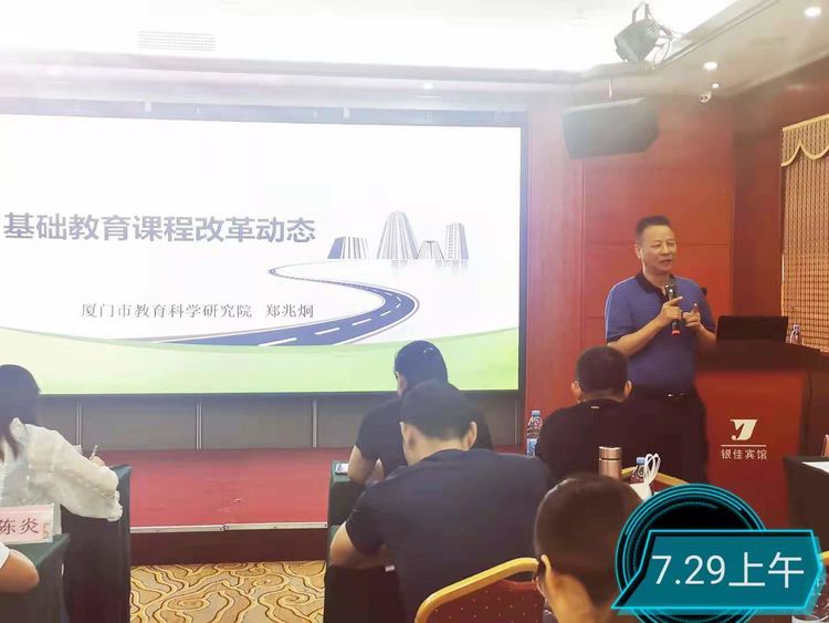 7月29日上午,厦门市教育科学研究院培训部一一郑兆炯主任。为学员们带来《基础教育课程改革的动态与趋势》的讲座。郑主任从生物学科的特点出发,从各式各样的问题出发,从对世界上教育发达国家的观察思考出发,带领我们对当今基础教育课程改革的动态与趋势进行了一番学习与讨论。课堂上郑老师不断地向学员提出各种问题,引导大家思考,比较分析美国、芬兰和中国的基础教育改革优缺点。最后郑主任向学代们提出了殷切的期望:做员工的领路人而不仅仅是教书匠,是一个课程的开发者而不仅仅是教材的代言人。