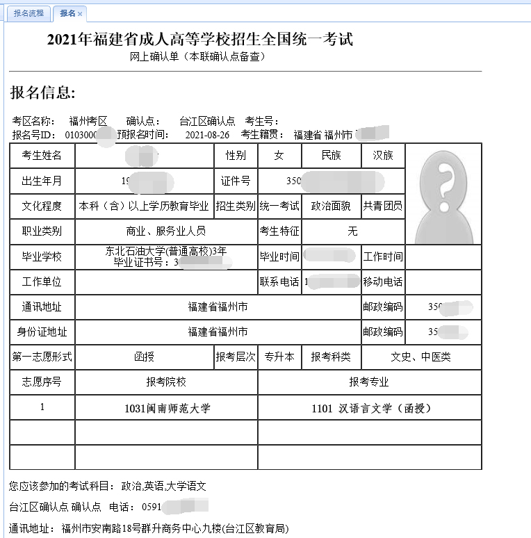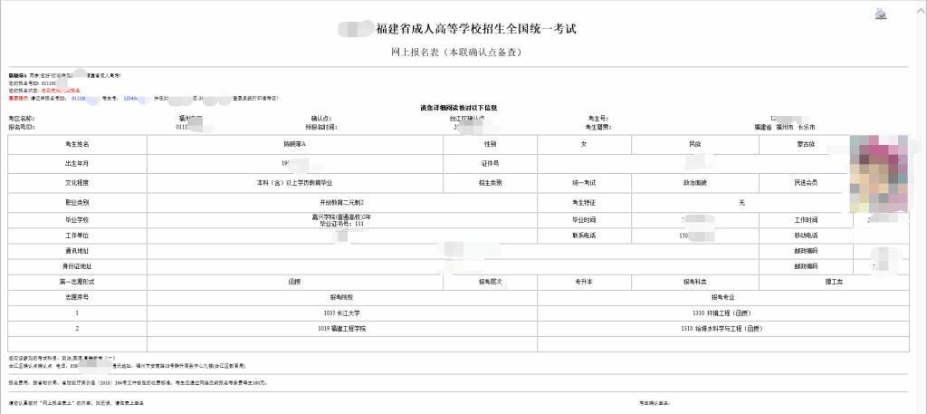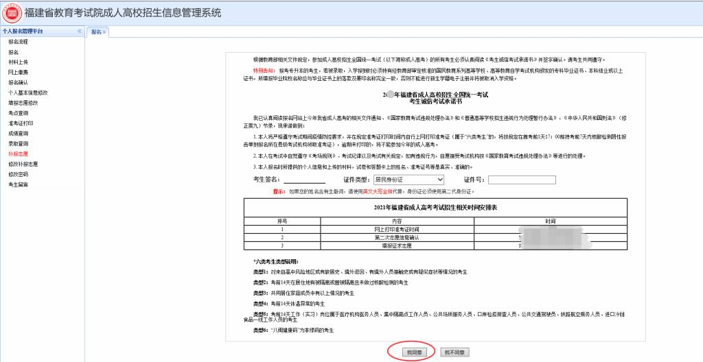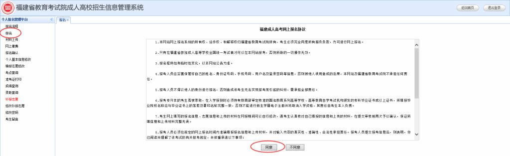 注:与《福建成人高考网上报名协议 》一样,只有同意,才能继续报名操作;若不同意,则跳转上级目录。