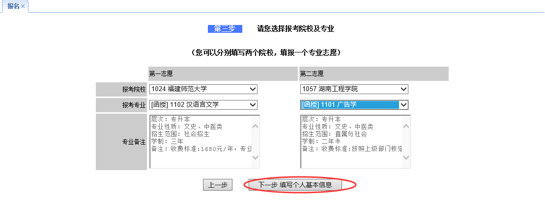 选择完毕后,点击“下一步 进行志愿专业选择”进入报考院校及专业信息的选择,如下图: