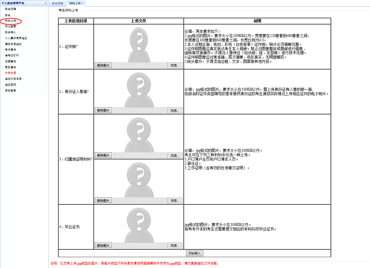 点击左上的“材料上传”,进入材料上传模块。
