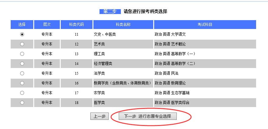点击“下一步,进行科类报考选择”,进入报考科类信息的选择,如下图: